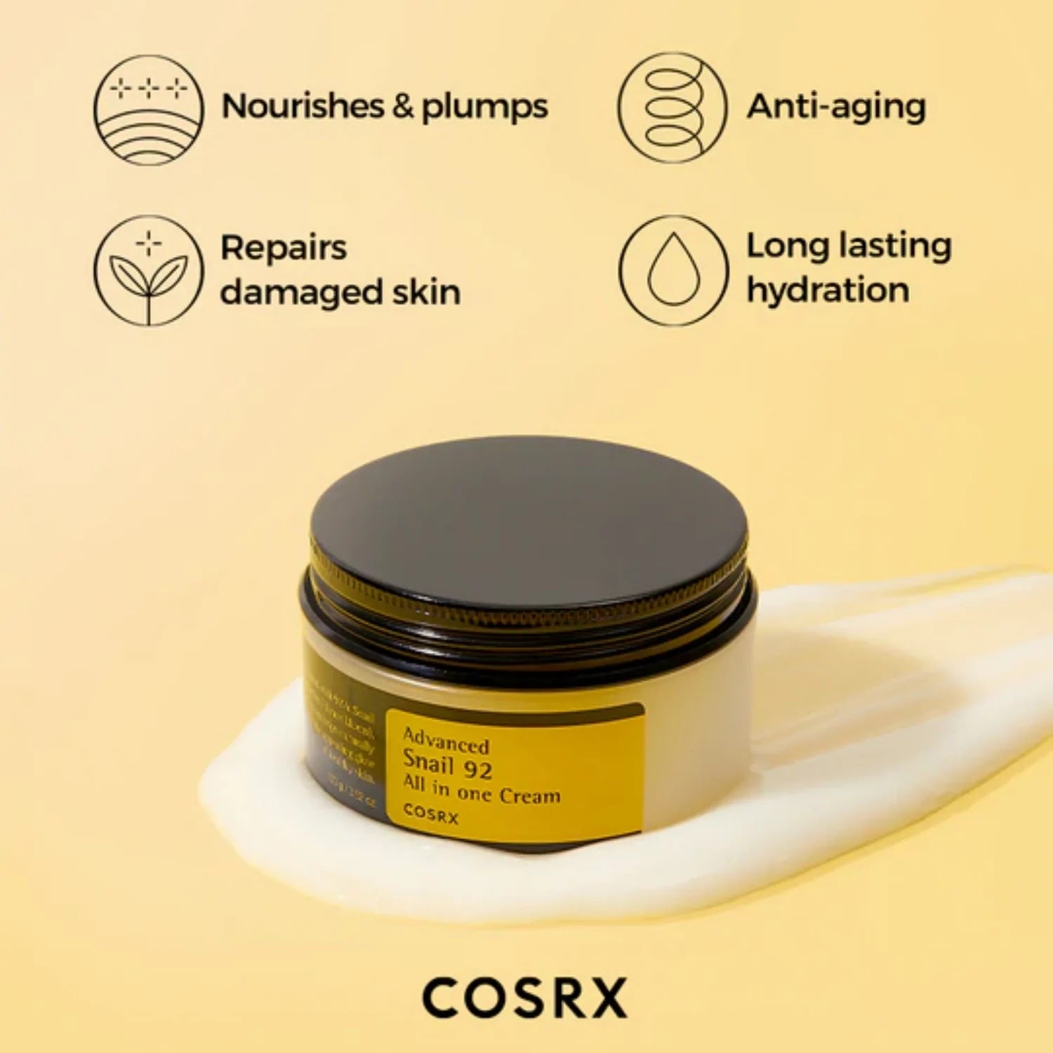 يحتوي هذا الكريم على 92% من مخاط الحلزون، ينساب على البشرة ويشكل حاجزًا مرطبًا لترطيب البشرة وتهدئتها.