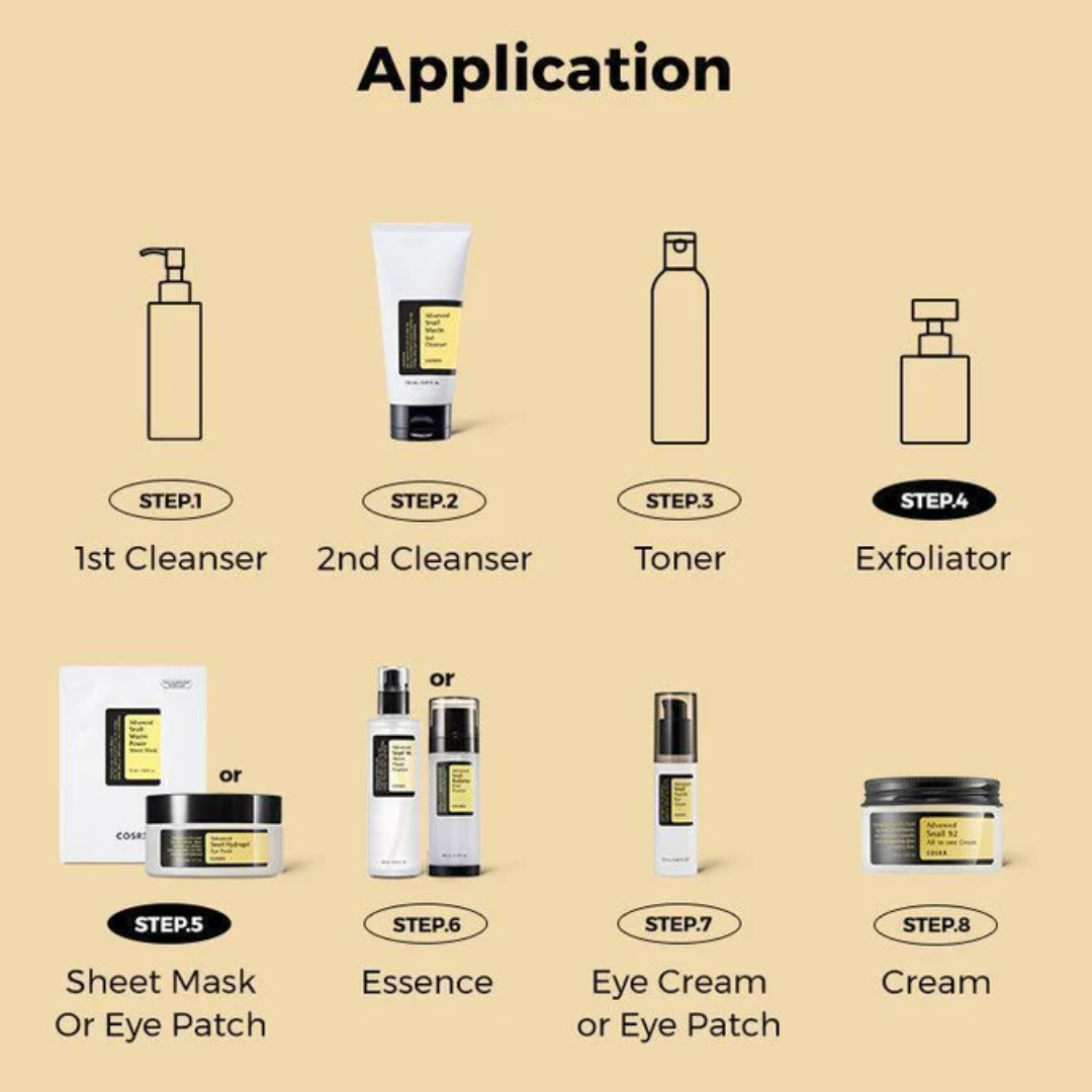 ماء، جلسرين، مُرَشَّح إفرازات الحلزون، نياسيناميد، كاراجينان، 1،2-هيكسانيديول، صمغ الخروب (سيراتونيا سيليكوا)، بيتايين، هيدروكسي أسيتوفينون، ألانتوين، كلورفينيسين، صمغ الغوار (سياموبسيس تيتراجونولوبا)، كلوريد الكالسيوم، بوتيلين جليكول، سكروز، صمغ السليلوز، أدينوسين، كلوريد البوتاسيوم، جليسريزات ثنائي البوتاسيوم، إيثيل هكسيل جلسرين، PEG-90M
