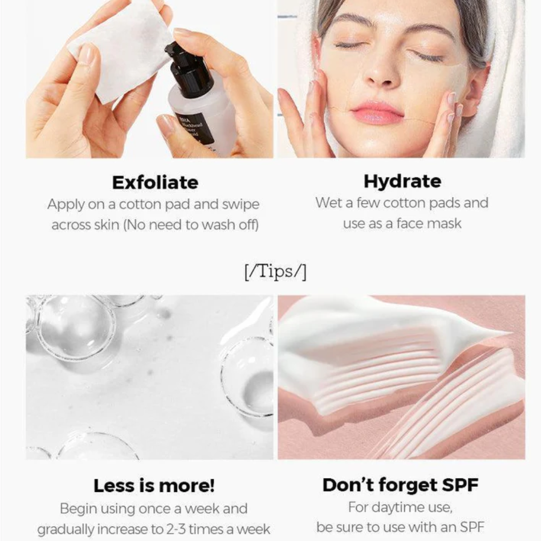 بعد التنظيف، يُستخدم كغسول للبشرة، أو تونر، أو مُستخلص. في حال استخدامه كتونر، تأكدي من امتصاص السائل بالكامل قبل وضع منتجات العناية بالبشرة التالية. يُنصح باستخدامه مرتين إلى ثلاث مرات أسبوعيًا، مع زيادة الجرعة تدريجيًا حسب حالة البشرة.